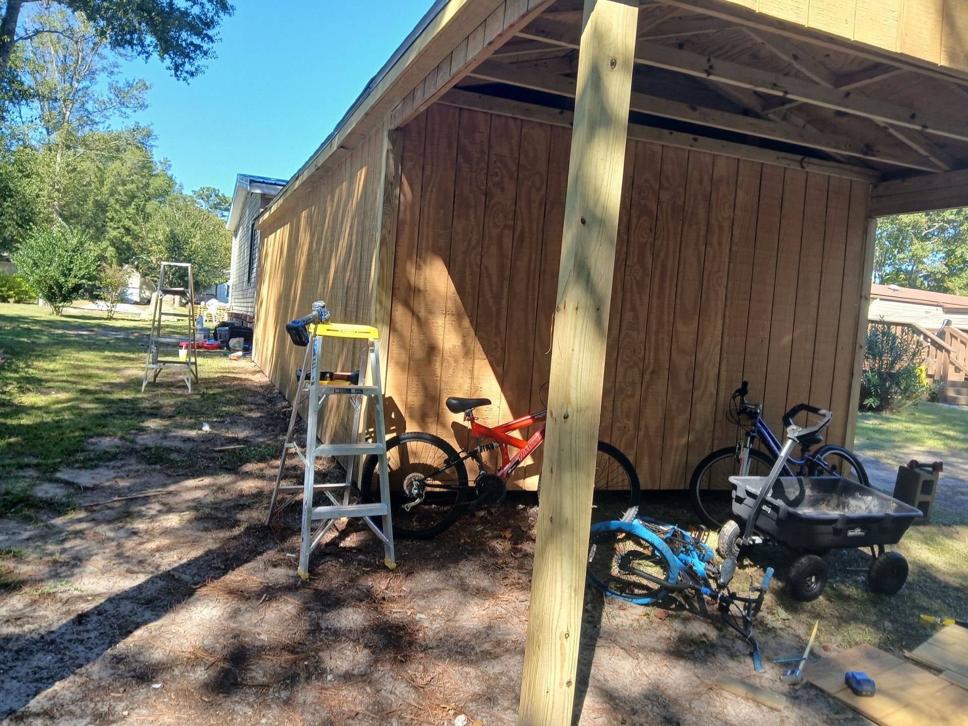Site work does not include grading beyond what is necessary for post installation or clearing vegetation outside the building footprint. If electrical service is required, running underground conduit from the main panel to the new structure adds time and cost. Homeowners should confirm local setback requirements and any permit needs before construction begins.